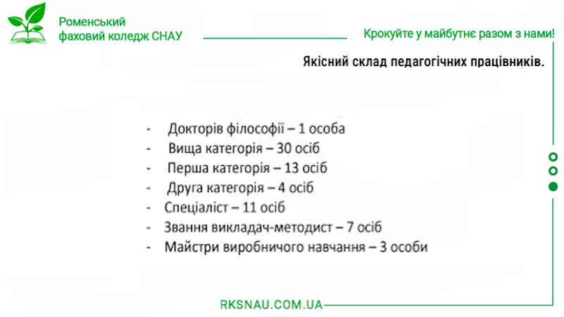 Кадровий склад педагогічних працівників ВСП «Роменський фаховий коледж СНАУ» — це команда досвідчених, висококваліфікованих викладачів і майстрів виробничого навчання, які поєднують ґрунтовні теоретичні знання з практичним досвідом, забезпечуючи якісну підготовку фахівців відповідно до сучасних вимог освіти та ринку праці.